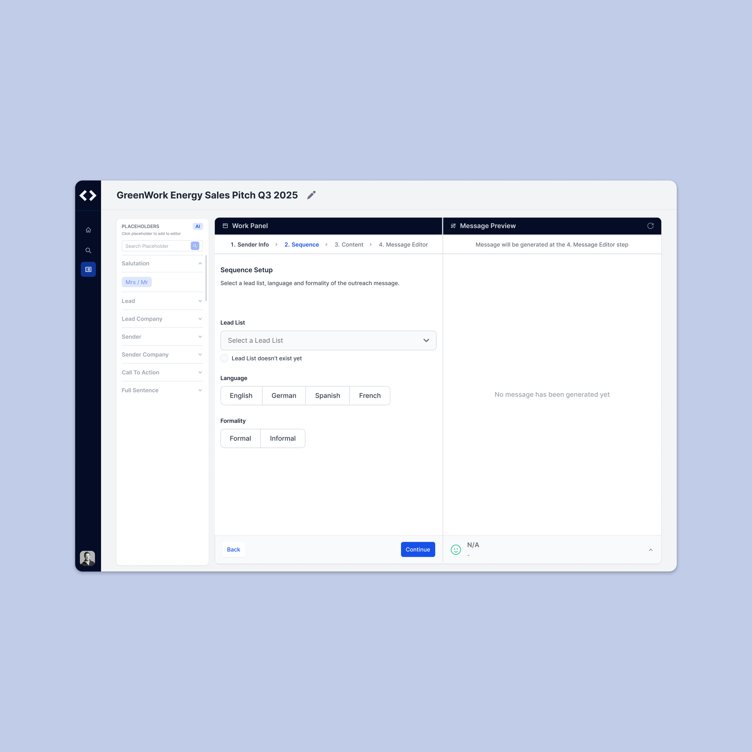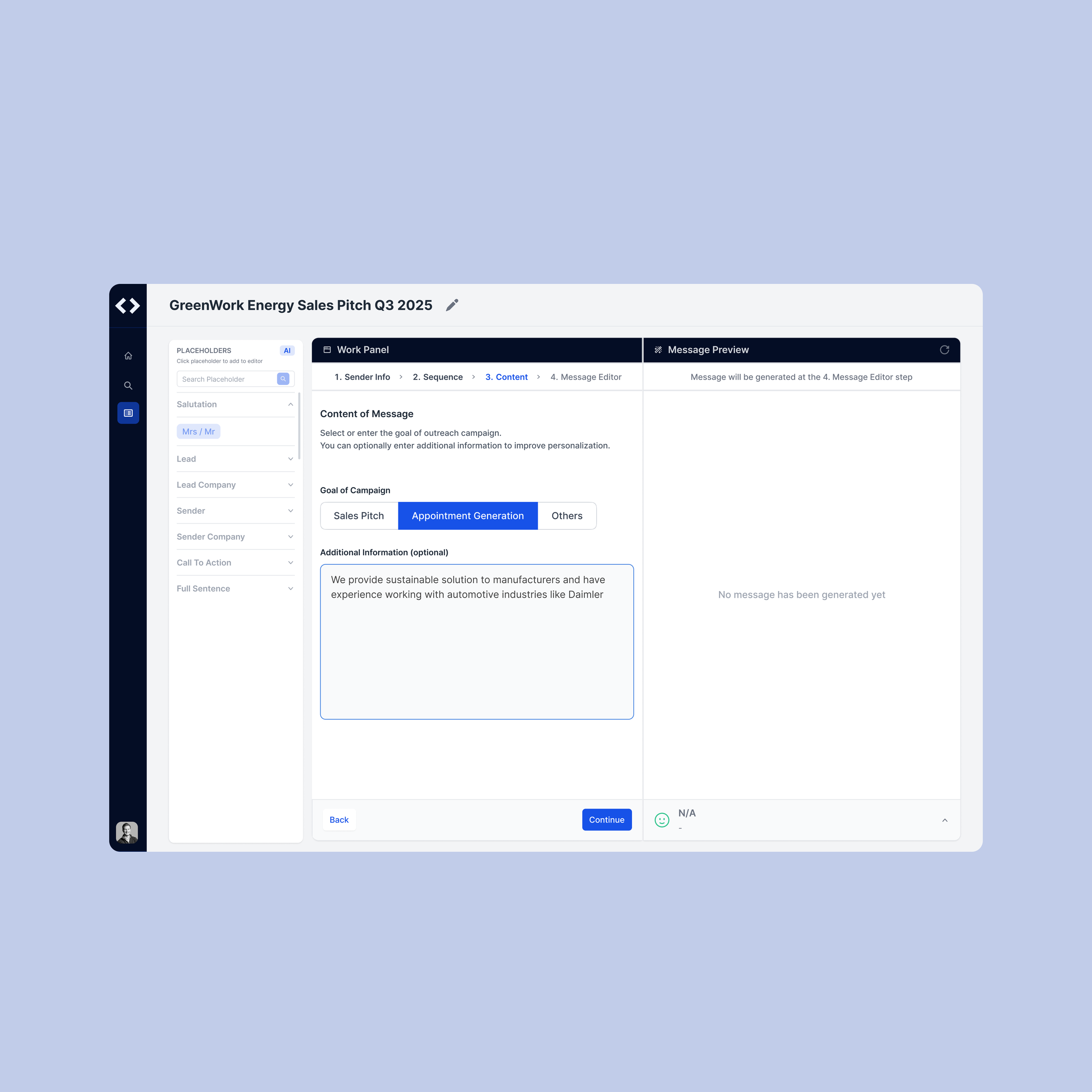 Once prompts are defined, the AI agent automatically generates outreach messages tailored to the chosen criteria. Instead of being locked into a static output, users are given full flexibility to refine the drafts — from adjusting tone and structure to managing placeholders — ensuring the final message reflects both the AI’s efficiency and the user’s personal touch.
