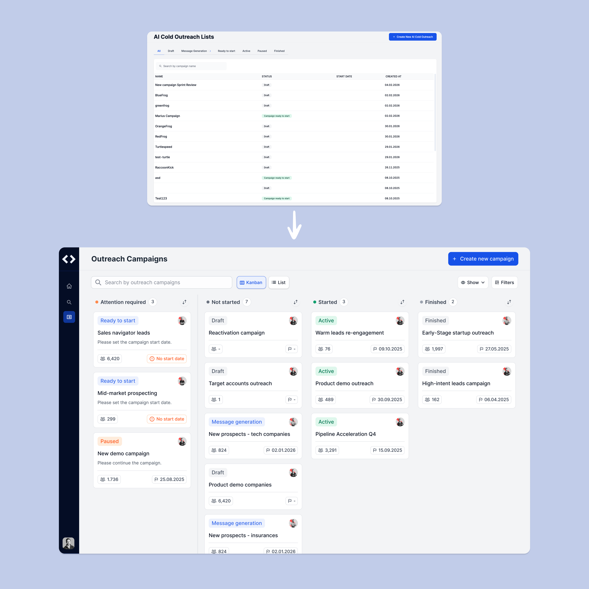 I redesigned this into a Status-based Kanban view to visualize the campaign lifecycle more effectively. The centerpiece of this redesign is the 'Attention Required' column, placed at the far left to immediately surface campaigns with missing start dates or critical errors. By transforming raw data into a prioritized task list, I enabled users to focus on high-impact actions rather than searching through rows, significantly increasing the overall operational efficiency of the platform